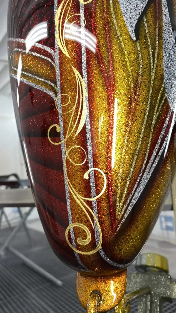 Réalisation peinture métal flakes sur réservoir d'Harley Davidson avec ornements à la feuille d'or 24 carats